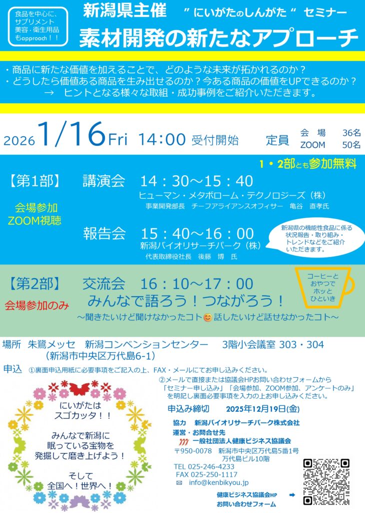 【募集】新潟県主催 ”にいがた の しんがたセミナー”「素材開発の新たなアプローチ」を開催します。 | 健康ビジネス協議会